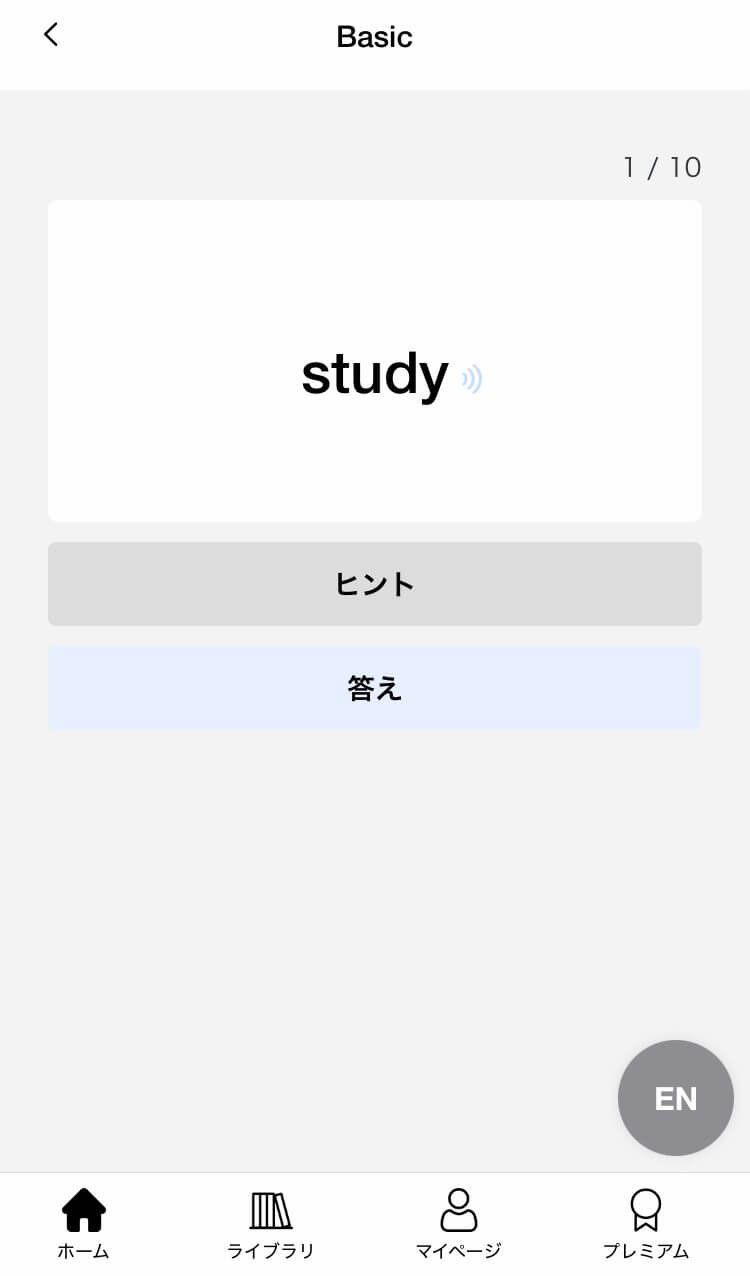 レッスン(出題)に進むと、単語のクイズに入ります。最初は「Study」という単語が出てきました。