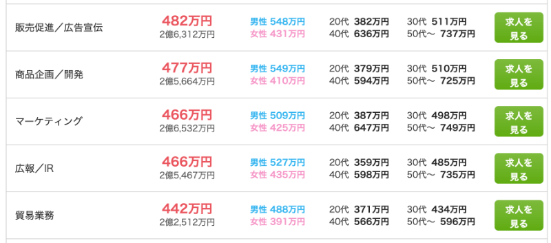 日本の正社員の平均年収が403万円だったため、マーケティングの年収は、日本人全体の平均と比べると高いことがわかります。