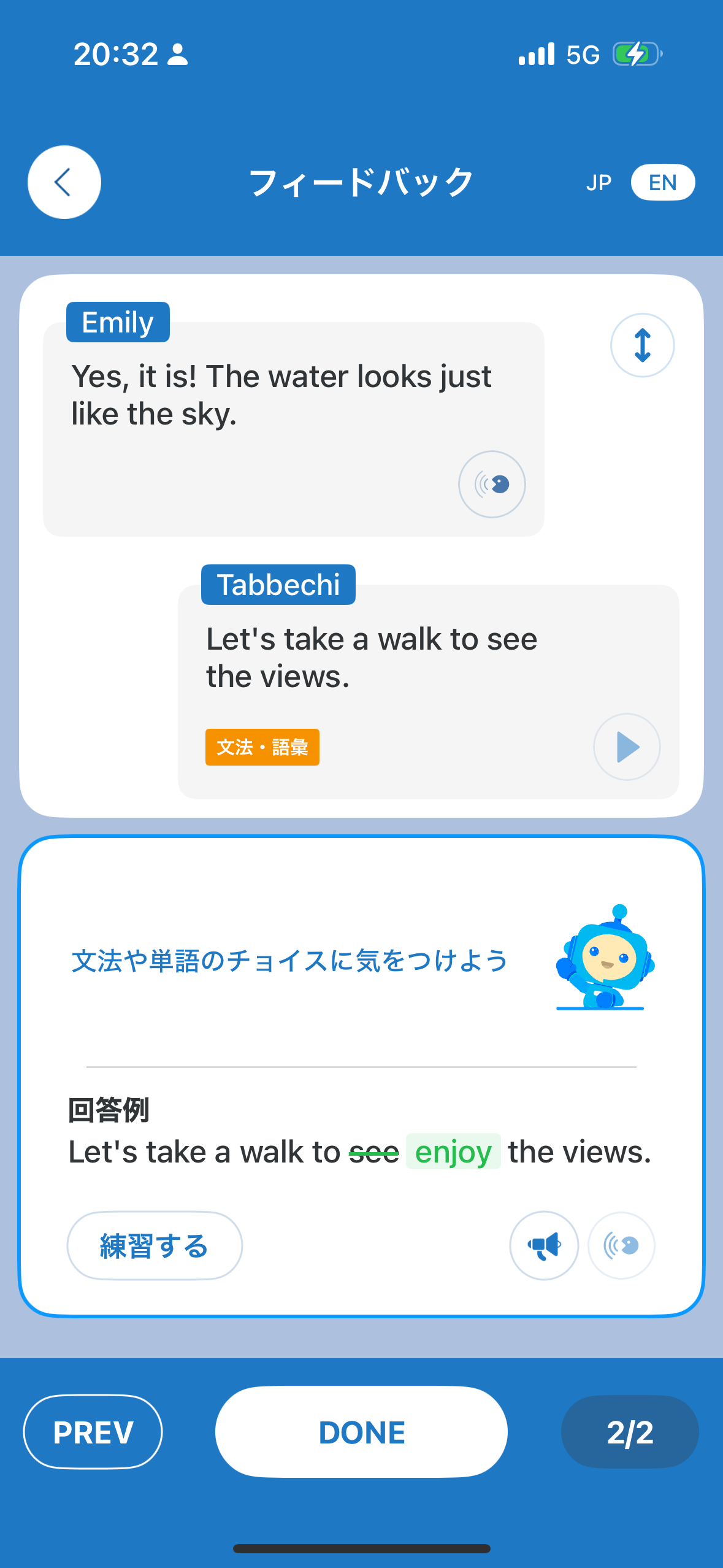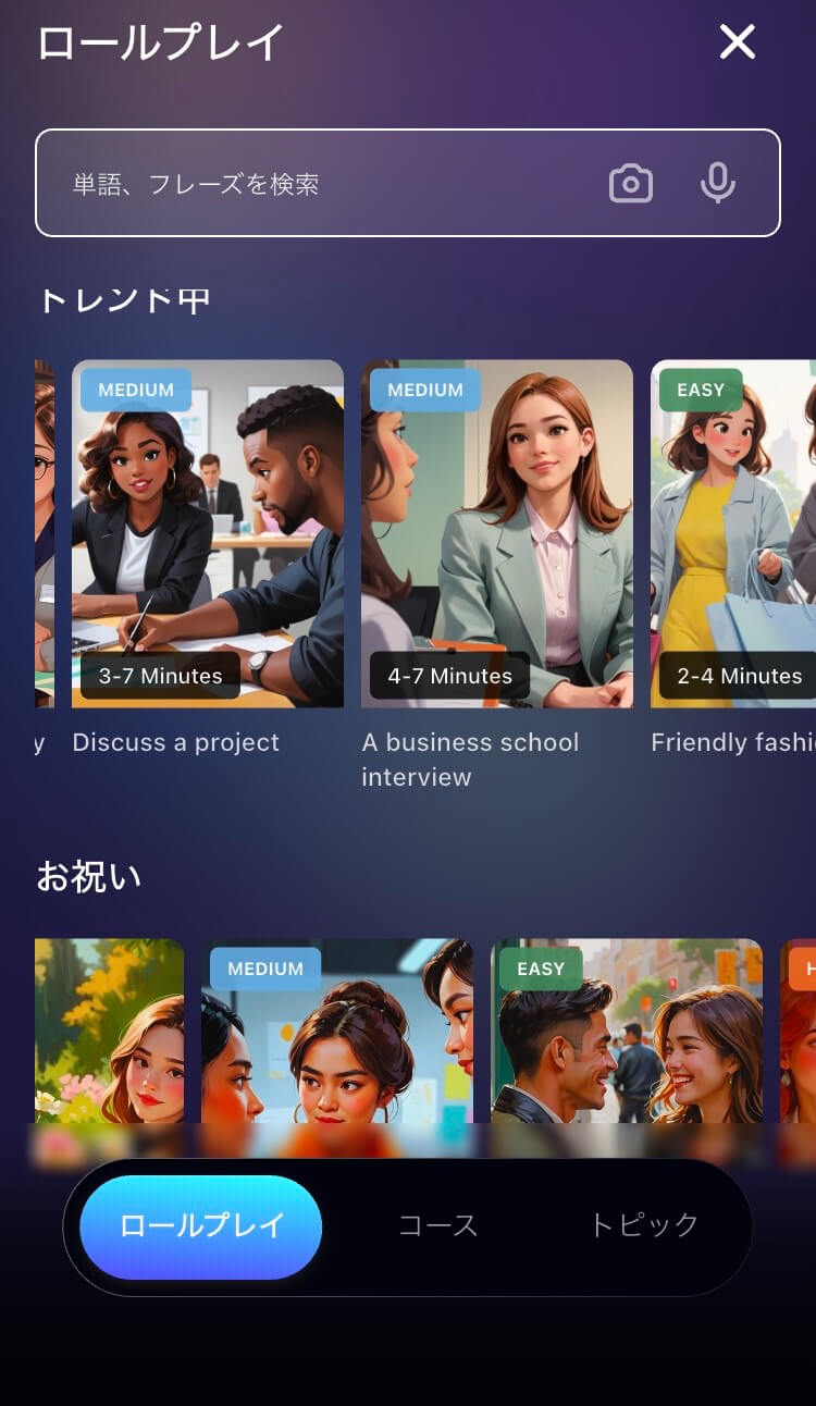 さまざまなシーンが用意されており、実際に外国人を相手に使える英会話を実践形式で学ぶことができます。AIが相手なので、気づかいや不安は一切無用で、何回でも繰り返し英会話の練習ができます。
