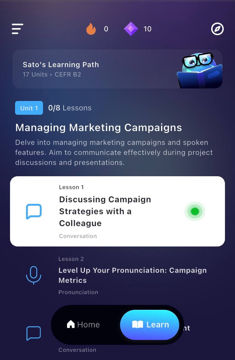 自宅で少し一息ついたタイミングもそうです。ソファで30分ゴロゴロするうちのわずか10分、AI英会話アプリと英会話を楽しむだけでも、英語を話す習慣が作られ、自然と英会話の力を伸ばすことが期待できます。
